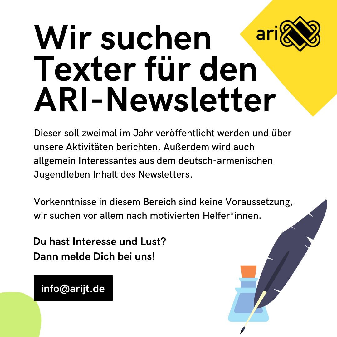 ARI startet ein neues Projekt: einen Newsletter. Dafür suchen wir noch nach freiwilligen Helfer*innen. Melde dich bei Interesse gerne bei uns!